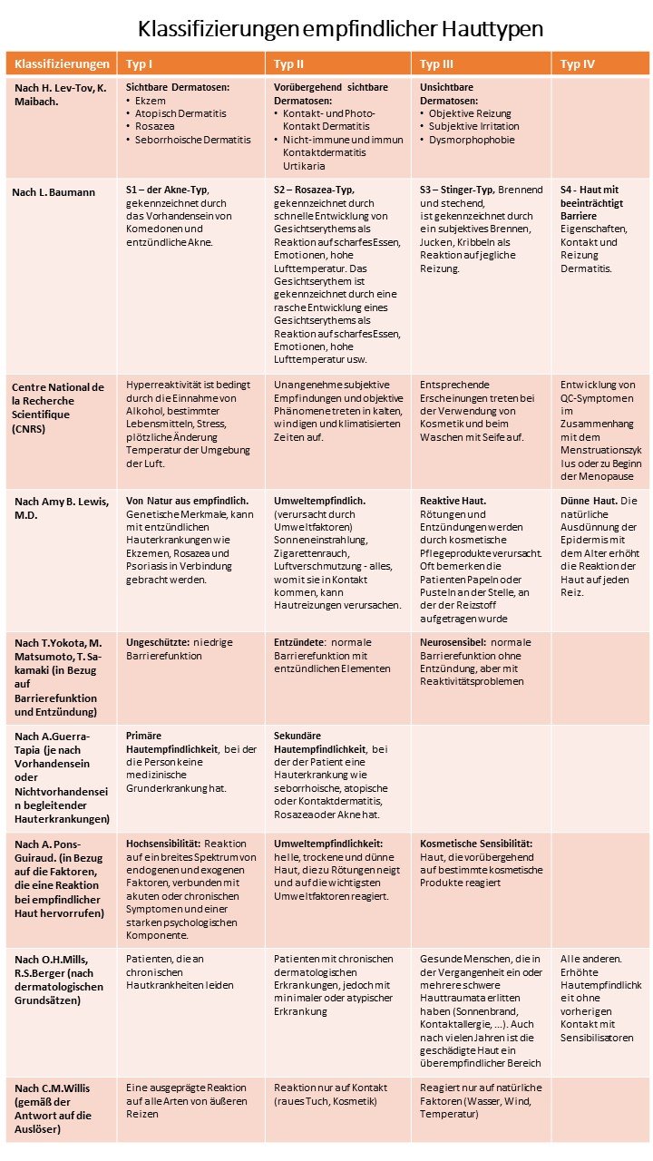 Die Vielfalt der Klassifizierungen empfindlicher Hauttypen spiegelt auch die mangelnde Einheitlichkeit der Dermatologen in dieser Frage wider: